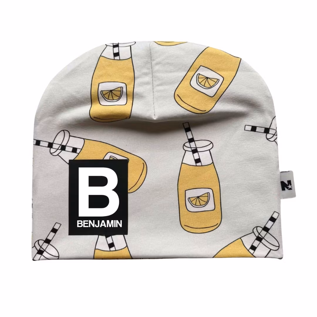 Tryckt namn/textmössa. Första bokstaven i namnet / texten blir den stora bokstaven